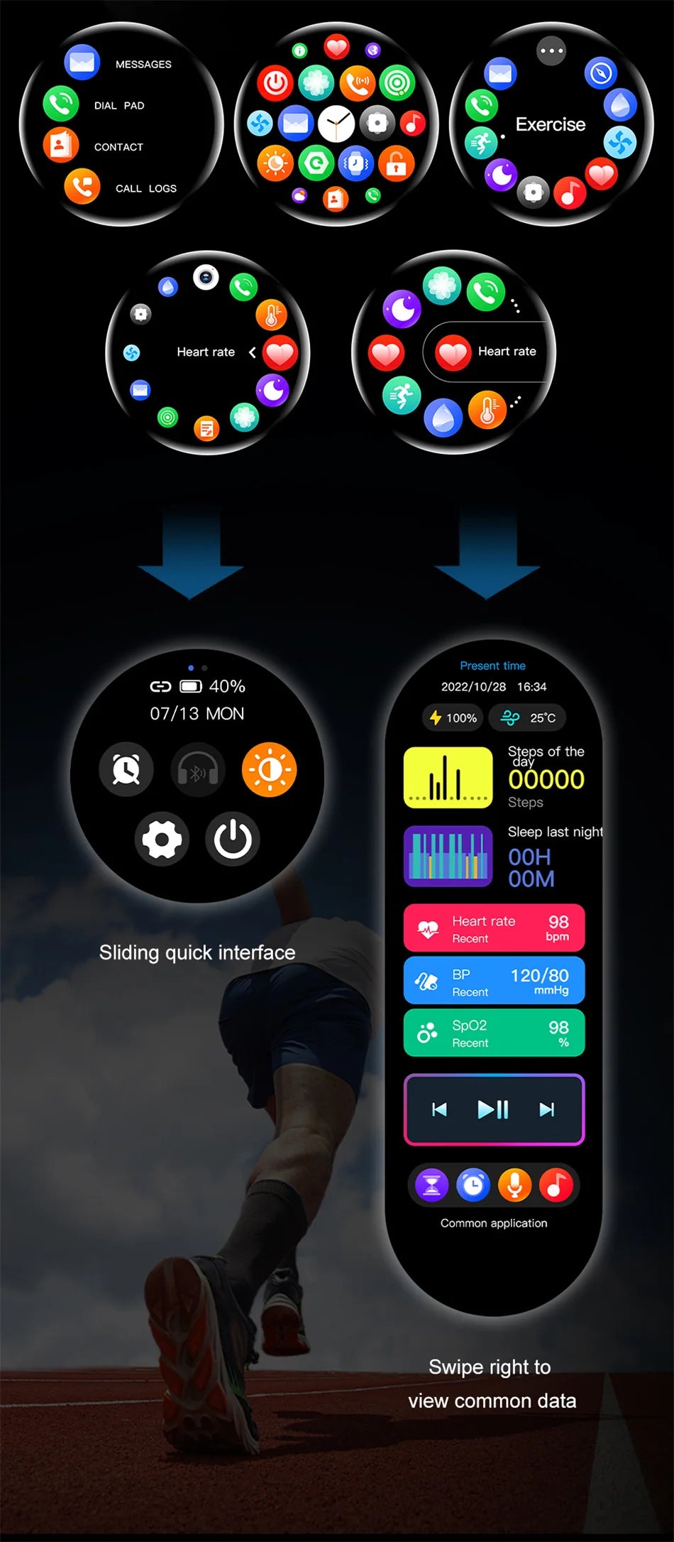 Main Functions: basic functions: bluetooth headset (2-in-1), compass, phone (contacts, call logs, dialling keypad, call settings, SOS), message push, exercise, pedometer, sleep detection, music, heart rate, blood pressure, blood oxygen, body temperature, women's health detection, medication reminder, water reminder, sedentary reminder, style switching, calendar, voice assistant, weather, take photos, calculator, breathing, My QR Code, Timer, Find Phone, Stopwatch, Exercise Tracks, Alarm Clock, Settings, Restore Factory Settings, Drinking Reminder, Sedentary Reminder, Split Screen (Swipe Right), Widget (Swipe Left)