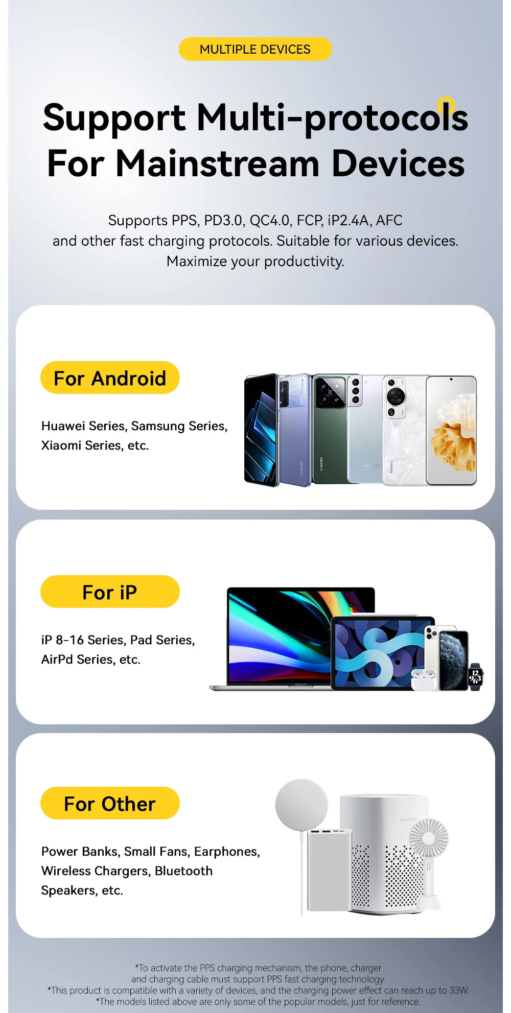 Type-C(33W Max) Output: 5V3A;9V3A;12V2.5A;15V2A20V1.5A;PPS:5V-11V-3A
