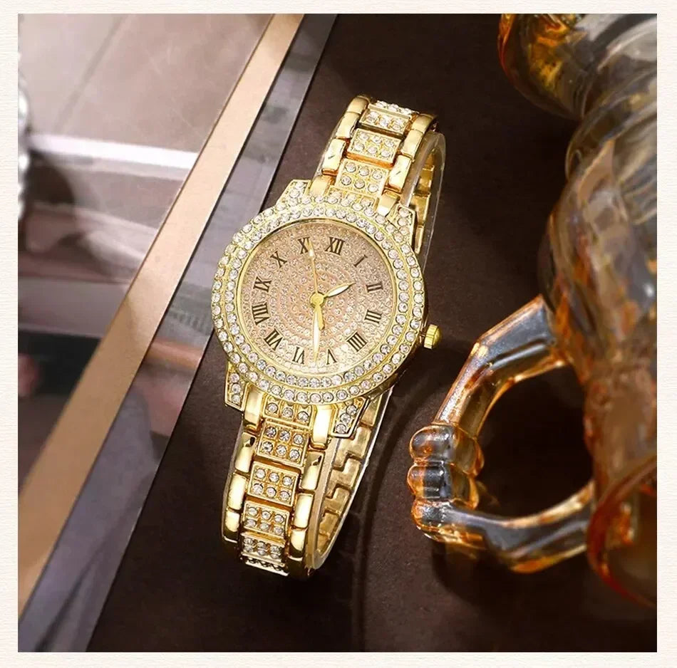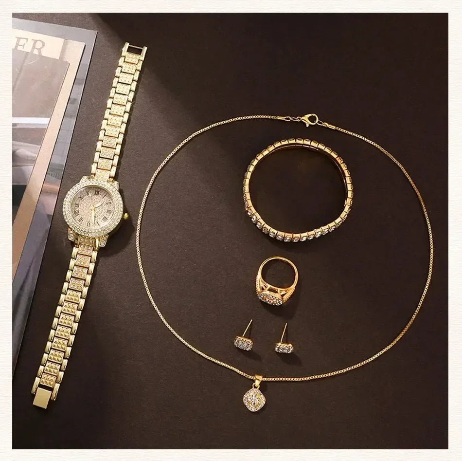 Golden Watch Women Ring Necklace Earrings Rhinestone Fashion Wristwatch Female Casual Ladies Watches Bracelet Set Clock