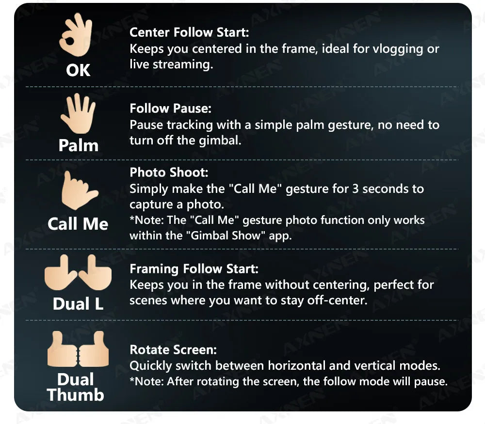 Note: The "Call Me" gesture photo function only works within the "Gimbal Show" app.