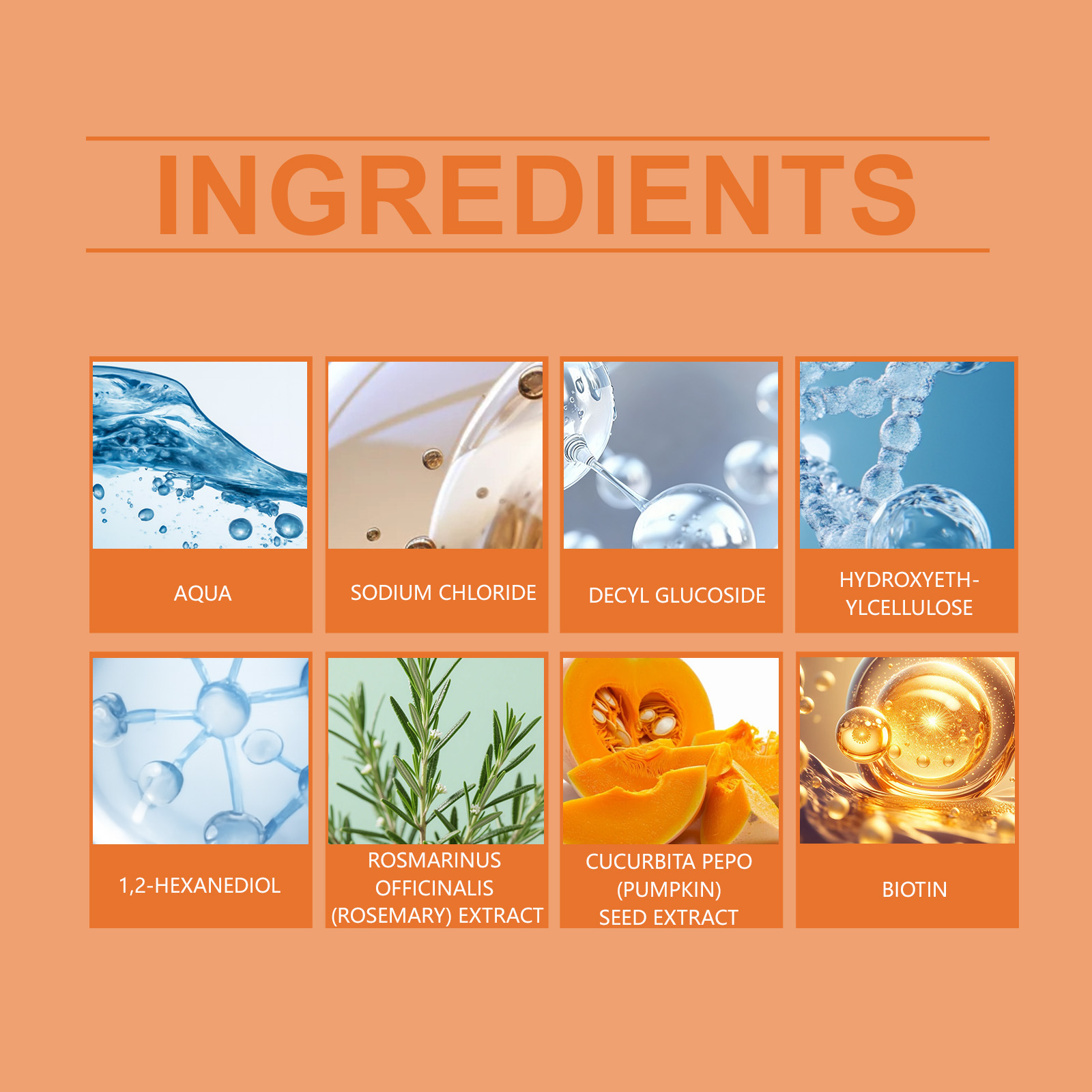 Ingredients: water, sodium chloride, decyl glucoside, hydroxyethyl cellulose, 1,2-hexanediol, rosemary extract, zucchini seed extract, biotin.