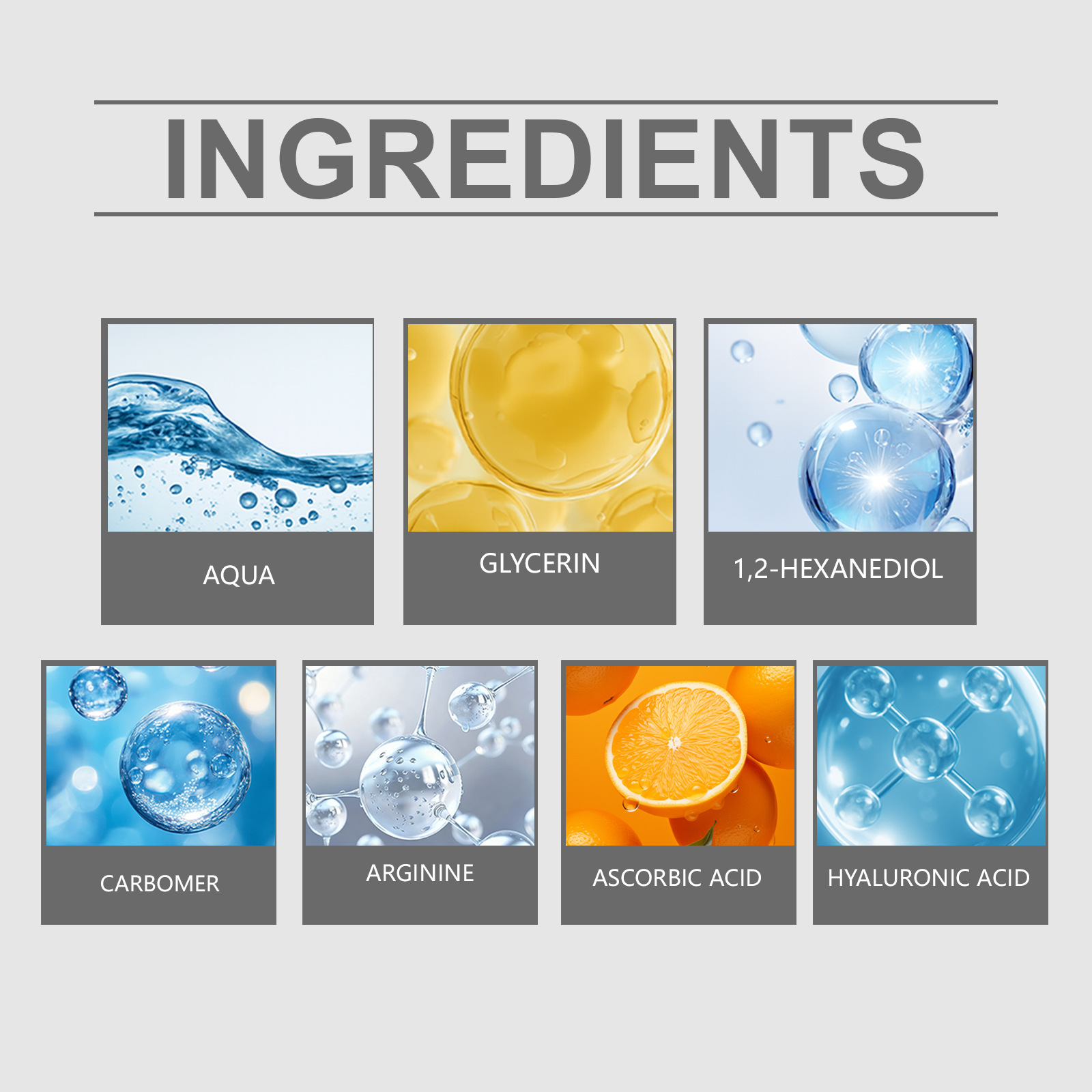 Ingredients: water, glycerin, 1,2- hexanediol, carbomer, arginine, ascorbic acid (vitamin C), hyaluronic acid.